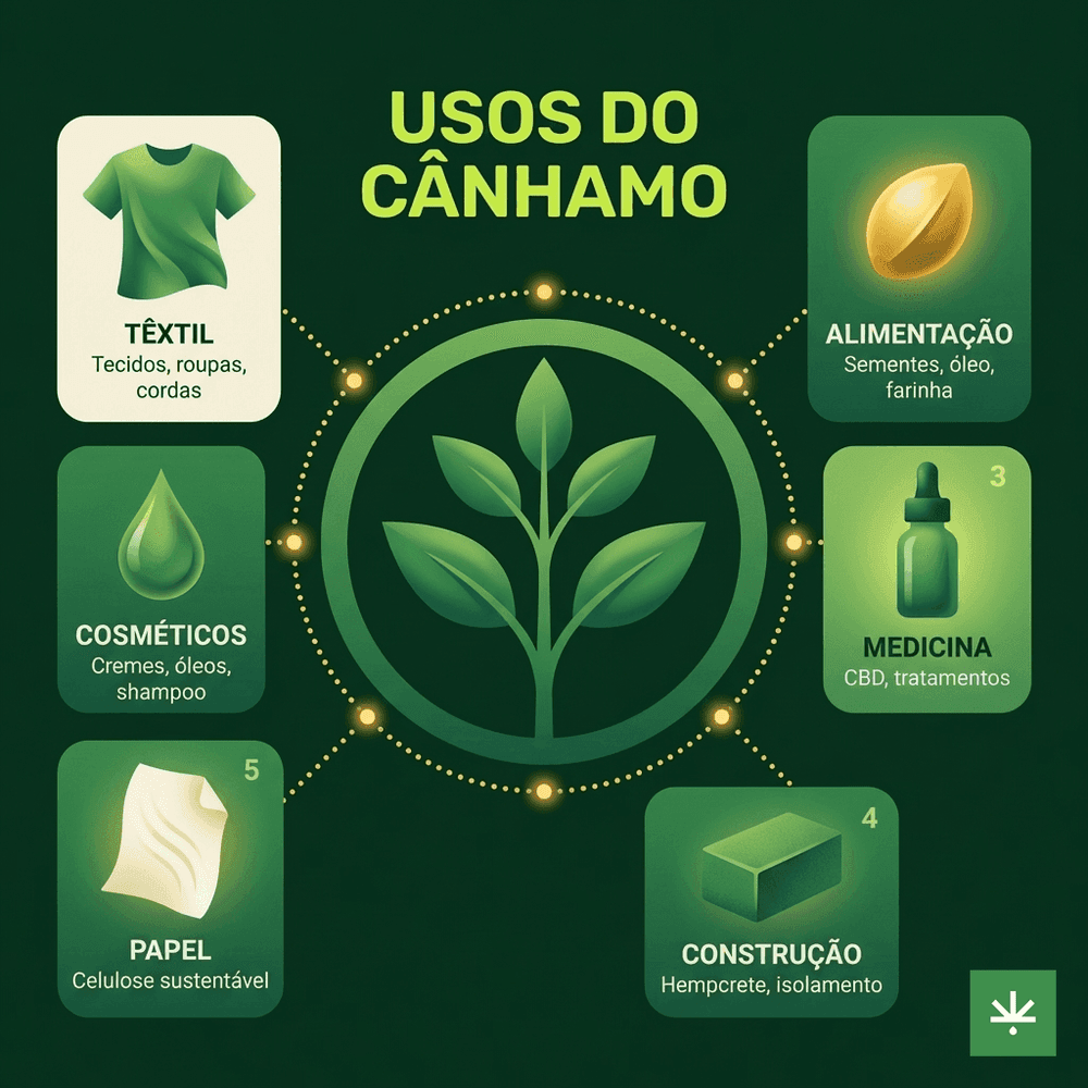 O cânhamo serve para produzir tecidos, alimentos (sementes, óleo, farinha), materiais de construção (hempcrete), cosméticos, papel, biocombustíveis e medicamentos à base de CBD. São mais de 25 mil aplicações documentadas.