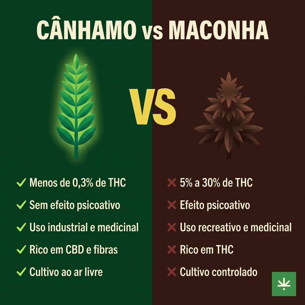 - O cânhamo é uma variedade da Cannabis sativa com menos de 0,3% de THC — não produz efeitos psicoativos e é rico em CBD, proteínas e fibras.