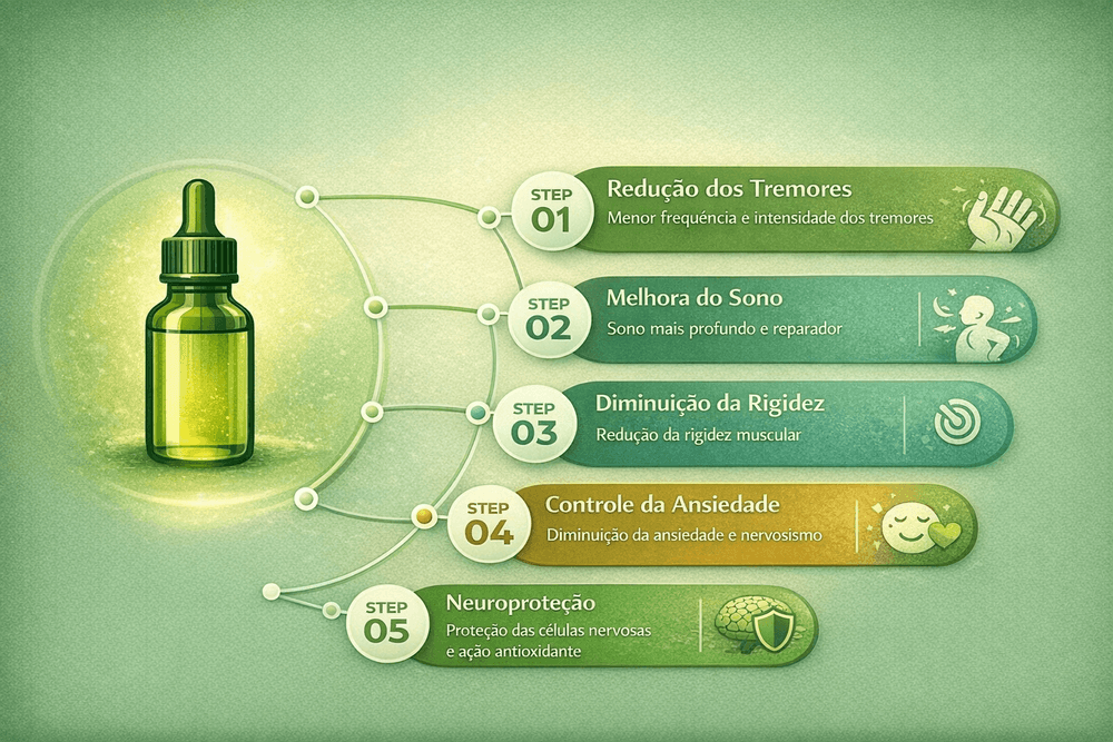 Embora o canabidiol (CBD) não represente uma cura para a Doença de Parkinson, estudos e relatos clínicos indicam que ele pode ser um importante aliado no manejo diário dos sintomas. Seus efeitos variam de pessoa para pessoa, mas alguns benefícios já observados incluem: