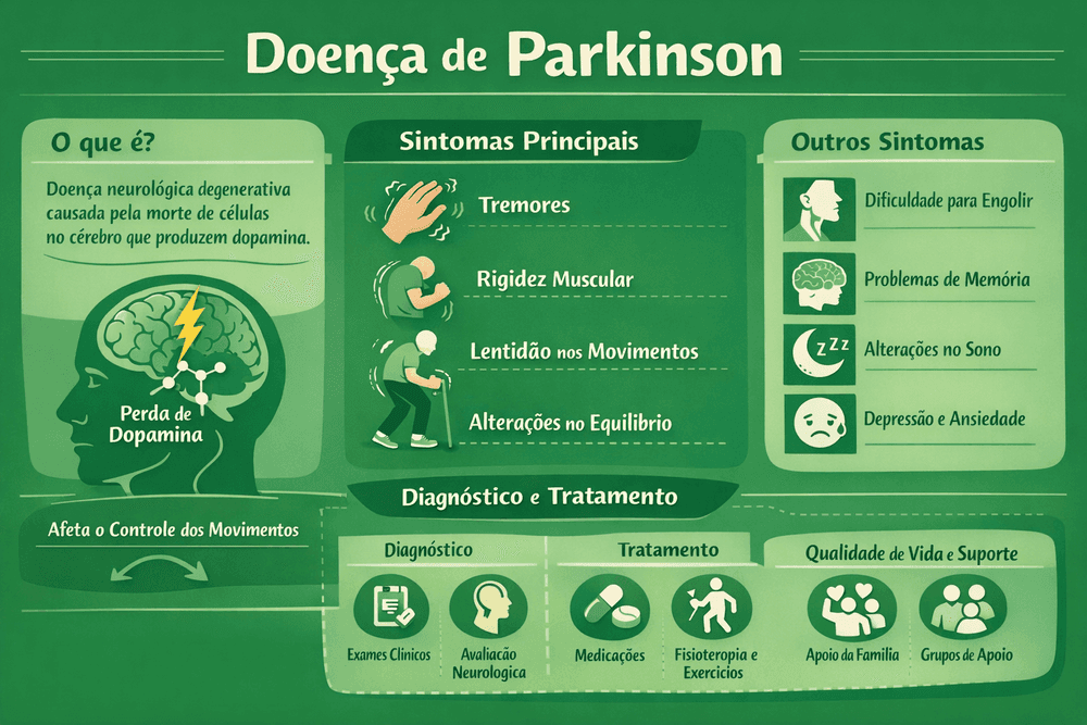 A Doença de Parkinson é um distúrbio neurológico progressivo que afeta o controle dos movimentos, causando tremores, rigidez muscular, lentidão motora e alterações de equilíbrio, além de sintomas não motores como ansiedade e distúrbios do sono.