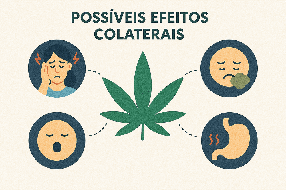 Embora o CBD seja geralmente bem tolerado, alguns efeitos colaterais podem ocorrer: sonolência, fadiga, alterações no apetite, diarreia, tontura e boca seca. Em casos mais raros, podem ocorrer interações medicamentosas e alterações de humor. A melhor forma de minimizar esses efeitos é iniciar com doses baixas e fazer um acompanhamento médico adequado.