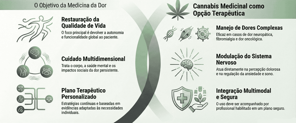 A cannabis medicinal pode ser uma opção dentro da abordagem multidimensional da Medicina da Dor, especialmente em casos de dor crônica refratária aos tratamentos convencionais. Nos últimos anos, o uso terapêutico de canabinoides tem sido estudado como estratégia complementar no manejo de dores complexas, como dor neuropática, fibromialgia e dor oncológica, atuando principalmente na modulação do sistema nervoso e na percepção dolorosa.