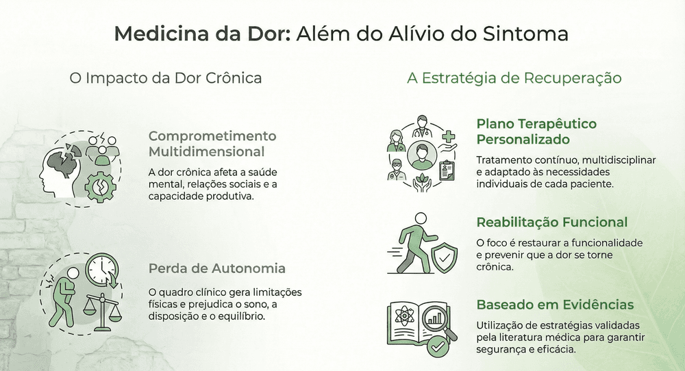 Não. O foco é compreender os mecanismos da dor, prevenir sua cronificação e restaurar a funcionalidade e o bem-estar global do paciente.