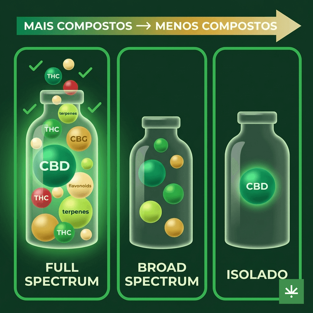 O Full Spectrum contém todos os compostos da planta, incluindo THC em doses legais. O Broad Spectrum mantém canabinoides e terpenos, mas remove o THC. O CBD Isolado contém apenas canabidiol puro (99%+), sem outros compostos. O Full Spectrum é considerado o mais eficaz terapeuticamente devido ao efeito entourage.